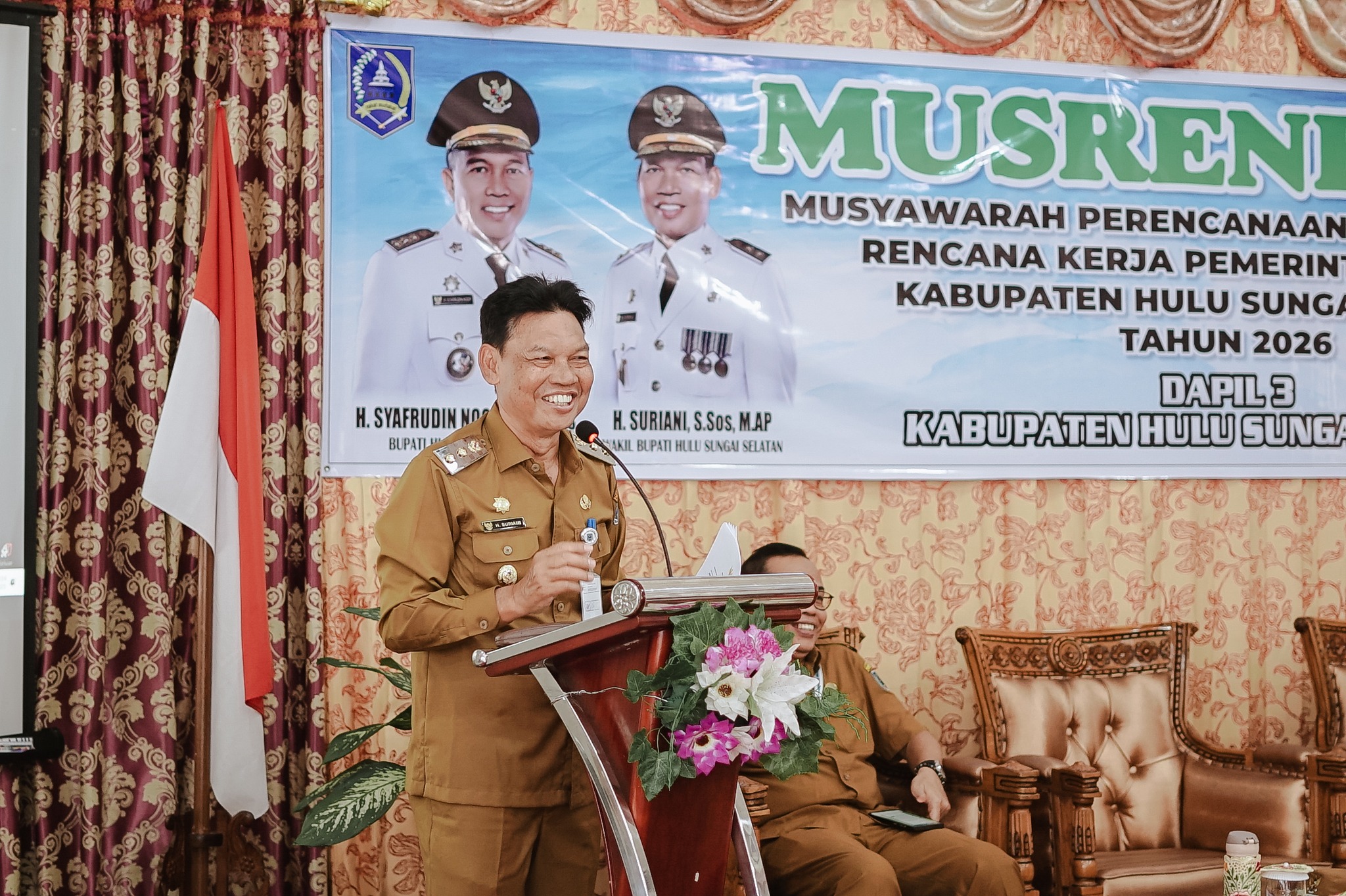 Wakil Bupati H. Suriani, yang membacakan sambutan Bupati HSS, menekankan bahwa Musrenbang ini menjadi langkah awal dalam perencanaan pembangunan tahun mendatang. “Kegiatan ini menandai dimulainya penyusunan Rencana Kerja Pemerintah Daerah dan Rencana Kerja Perangkat Daerah tahun 2026,” katanya.