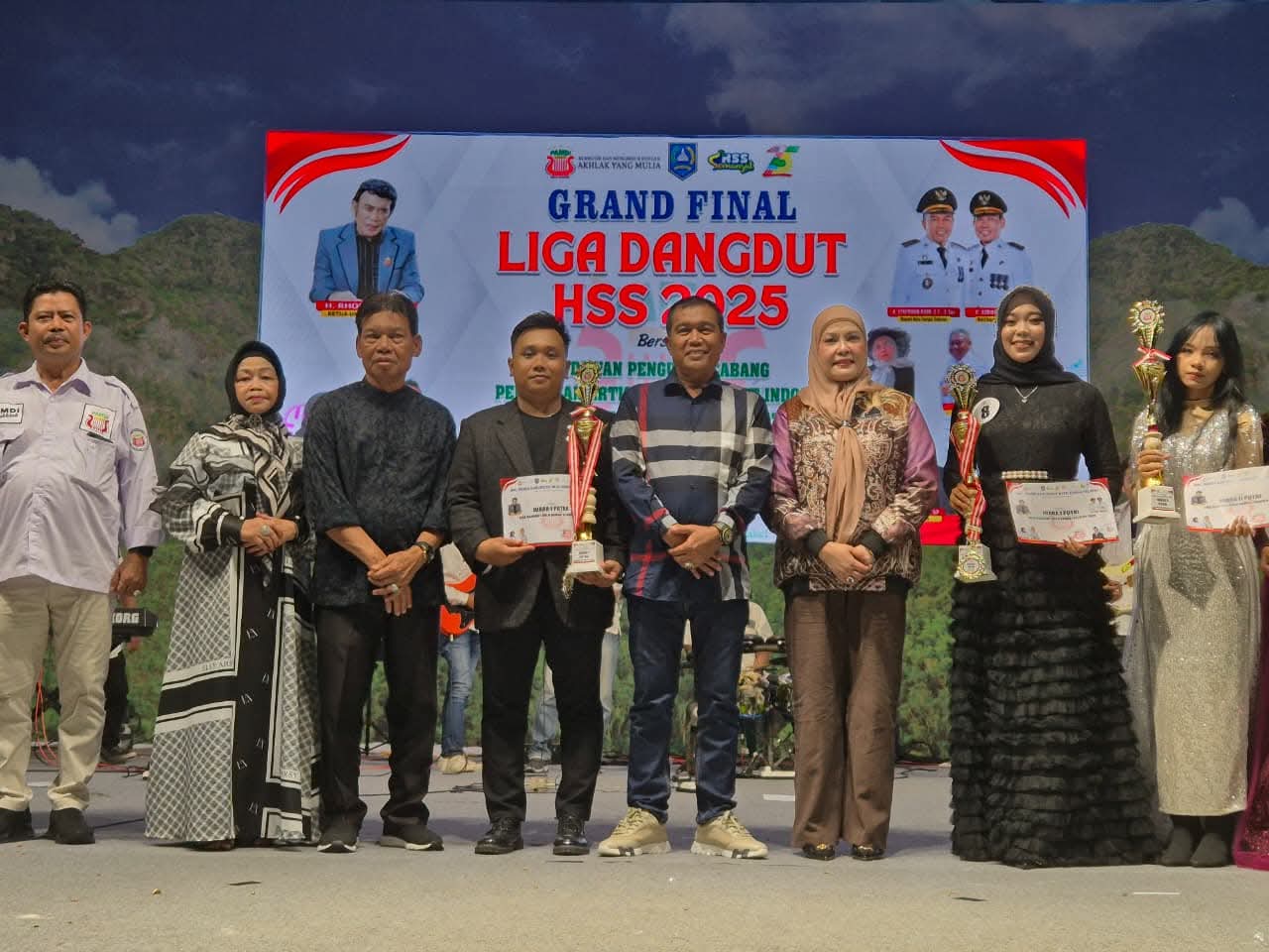 Suasana penuh kehangatan menyertai penutupan acara, ditandai dengan penyerahan penghargaan kepada para juara Liga Dangdut HSS 2025. Momen tersebut sekaligus menjadi penanda keberhasilan penyelenggaraan kompetisi tahunan ini, yang kini menjadi agenda bergengsi dalam memperingati Hari Jadi Kabupaten Hulu Sungai Selatan.