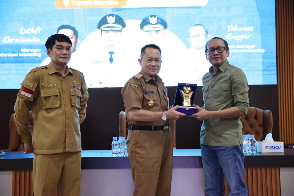 Asisten Bidang Perekonomian dan Pembangunan, Eryanto Rais, menyerahkan cenderamata kepada narasumber usai membuka secara resmi kegiatan Pelatihan Jurnalistik yang diselenggarakan oleh Diskominfosp Tanah Bumbu, Senin (25/8/2025). (Foto: Mc Tanbu/Nusawarta.id)