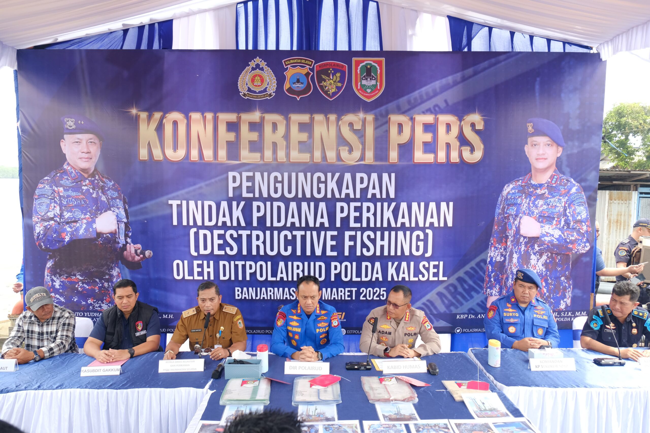 Konferensi pers ini turut dihadiri oleh Kabid Humas Polda Kalsel Kombes Pol Adam Erwindi, S.I.K., M.H., Kepala Dinas Kelautan dan Perikanan Provinsi Kalsel Rusdi Hartono, S.Pi., M.P., Kasubdit Gakkum Ditpolairud Polda Kalsel AKBP Yeremias Tony Putrawan, S.I.K., M.H., Komandan KP Tekukur 5010 Kompol Suryo, S.ST.Pel., S.H., serta Koordinator Satwas SDKP Kota Banjarmasin Harianto, S.ST.Pi.