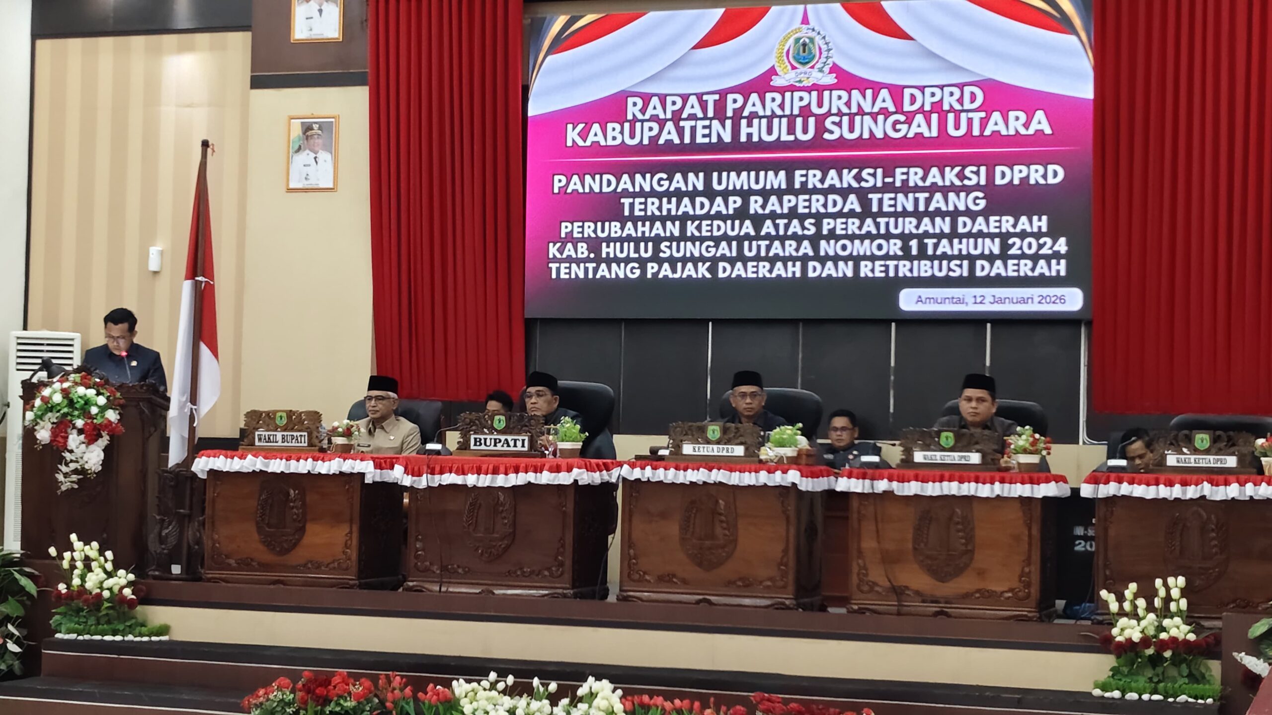 Rapat Paripurna dengan agenda Pemandangan Umum Fraksi-Fraksi DPRD terhadap Raperda tentang Perubahan Kedua atas Peraturan Daerah Kabupaten Hulu Sungai Utara Nomor 1 Tahun 2024 tentang Pajak Daerah dan Retribusi Daerah, Senin (12/1/2026). (Foto: Nusawarta.id)