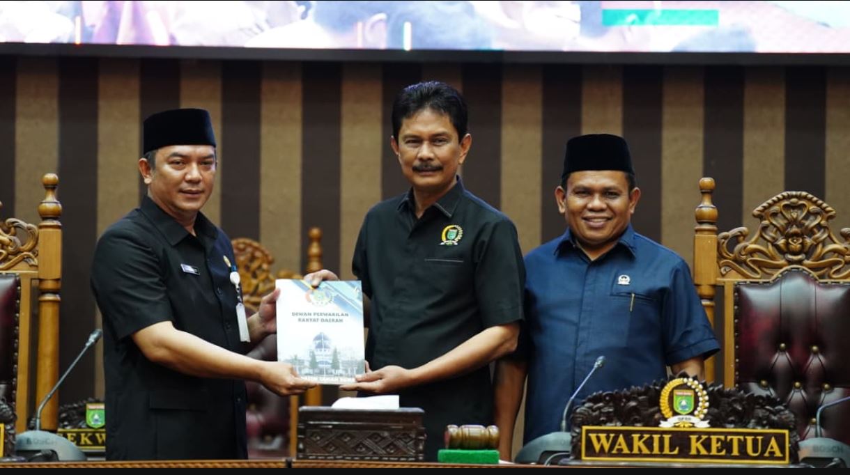 Plt. Asisten Pemerintahan dan Kesra Setda Tanah Bumbu, M. Putu Wisnu Wardhana, bersama Wakil Ketua DPRD Tanah Bumbu H. Hasanuddin, serta anggota DPRD lainnya saat mengikuti Rapat Paripurna penyampaian pemandangan umum fraksi terhadap Raperda Pembentukan 17 Desa Tahun 2025 di Gedung DPRD Tanah Bumbu, Selasa (7/10/2025). (Foto: Mc Tanbu/Nusawarta.id)