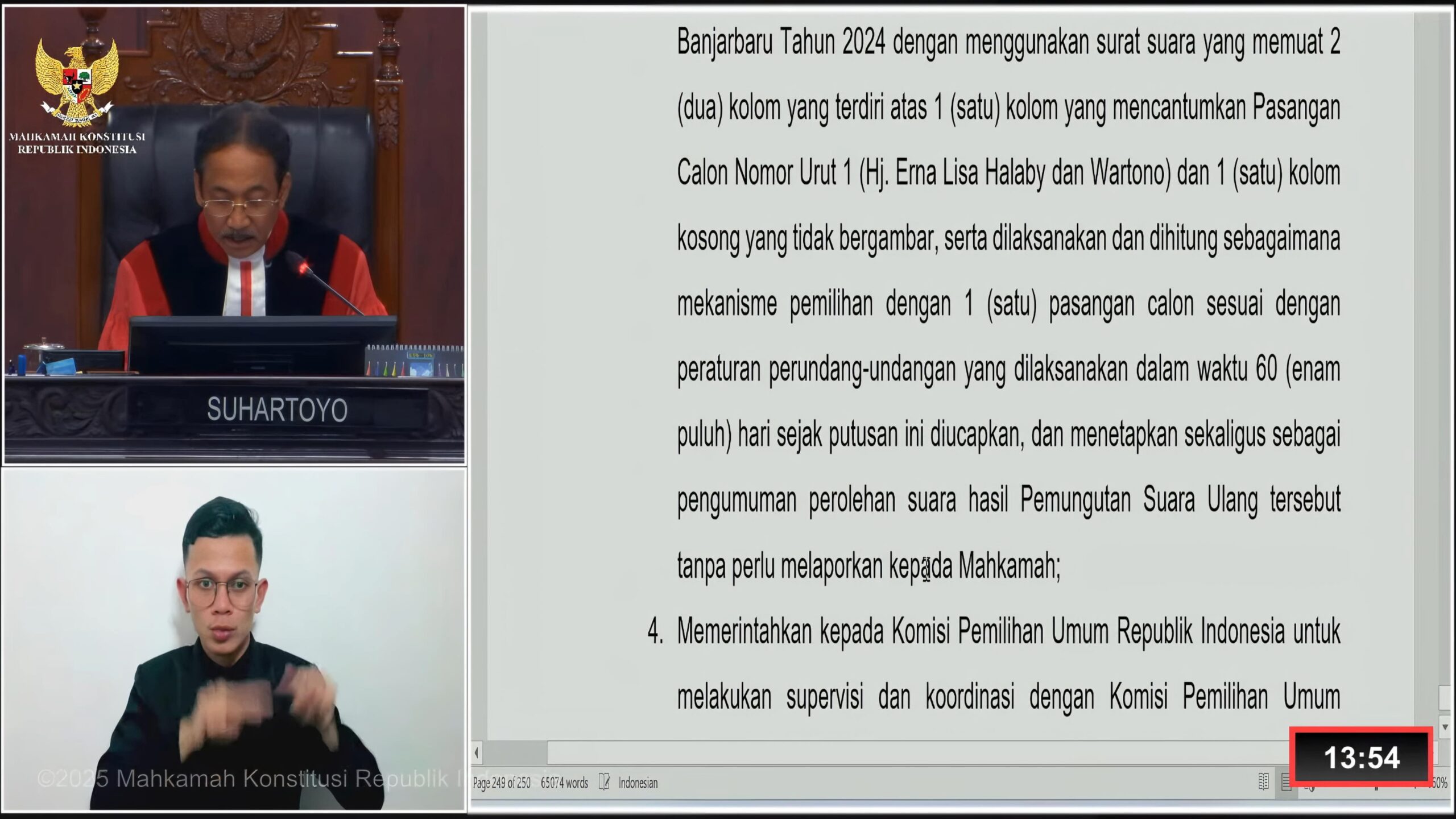 Tangkapan layar putusan Mahkamah Konstitusi terkait Pilwali Banjarbaru yang dibacakan pada Senin (24/02/2025) di Gedung MK, Jakarta (Foto: TangkapanLayar/Nusawarta.id)