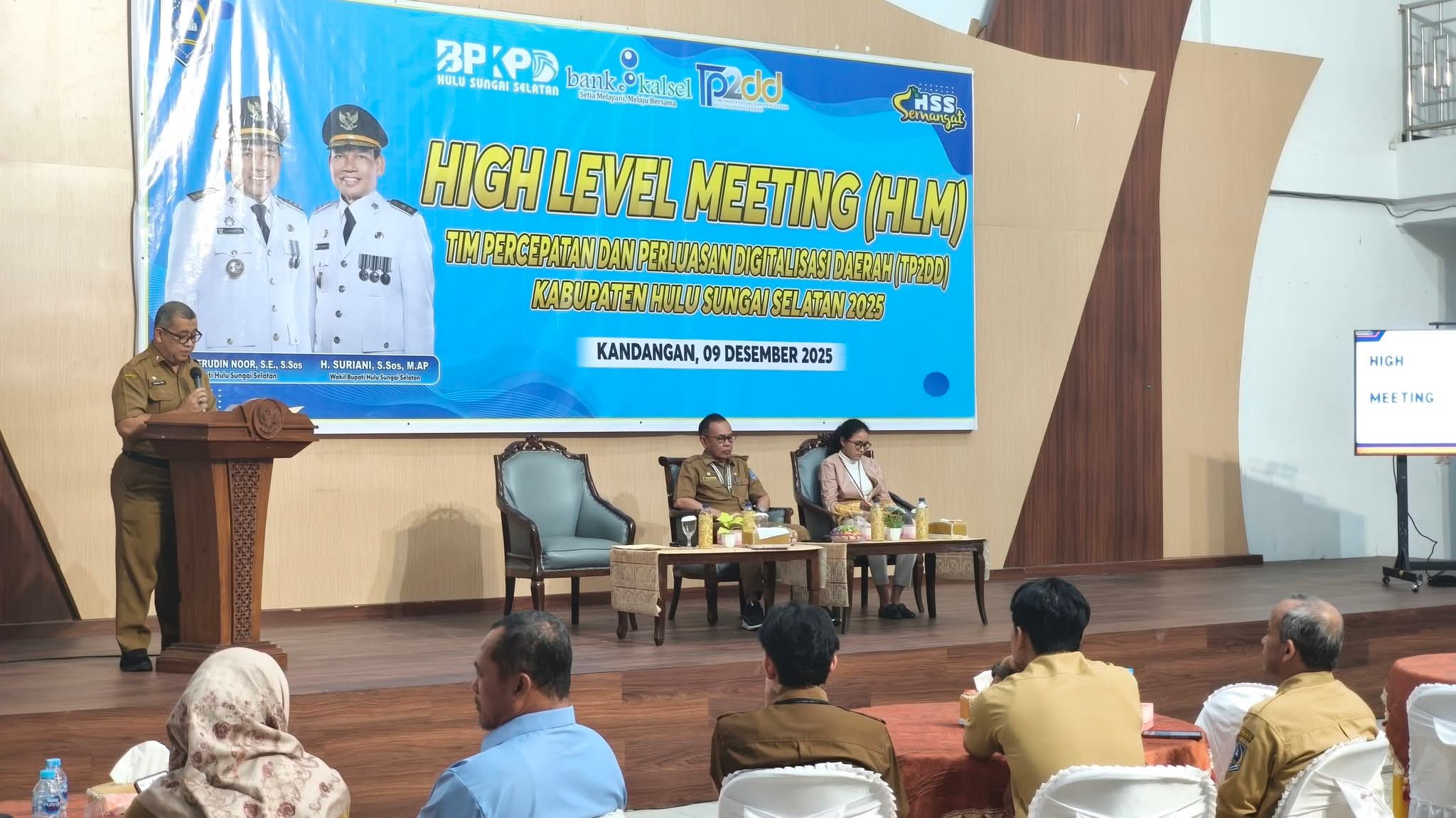 Nusawarta.id, Kandangan – Sekretaris Daerah Kabupaten Hulu Sungai Selatan (HSS), Drs. H. Muhammad Noor, M.AP, membuka secara resmi High Level Meeting (HLM) Tim Percepatan dan Perluasan Digitalisasi Daerah (TP2DD) Kabupaten HSS yang digelar di Gedung Pramuka HSS, Selasa (9/12/2025). Pertemuan tingkat tinggi ini menjadi momentum lanjutan dalam mendorong optimalisasi penerapan transaksi digital di lingkungan pemerintah daerah.