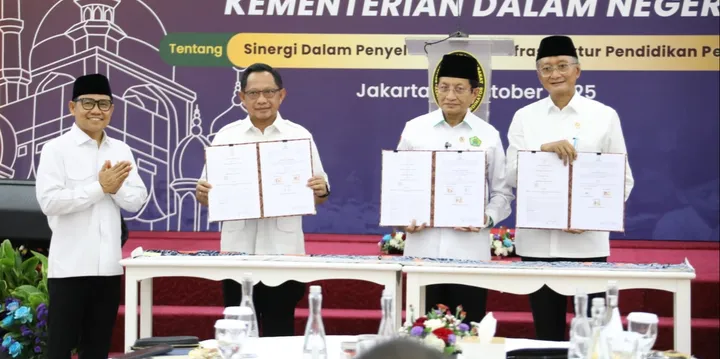 Nusawarta.id, Jakarta – Menteri Dalam Negeri (Mendagri) Muhammad Tito Karnavian meneken kesepakatan bersama dengan Menteri Pekerjaan Umum (PU) Dody Hanggodo dan Menteri Agama (Menag) Nasaruddin Umar. Kesepakatan tersebut mengenai sinergi dalam penyelenggaraan infrastruktur pendidikan pesantren. Prosesi itu disaksikan langsung oleh Menteri Koordinator (Menko) Bidang Pemberdayaan Masyarakat (PM) Muhaimin Iskandar di Gedung Heritage, Kementerian Koordinator (Kemenko) Bidang Pemberdayaan Masyarakat, Jakarta, Selasa (14/10/2025).